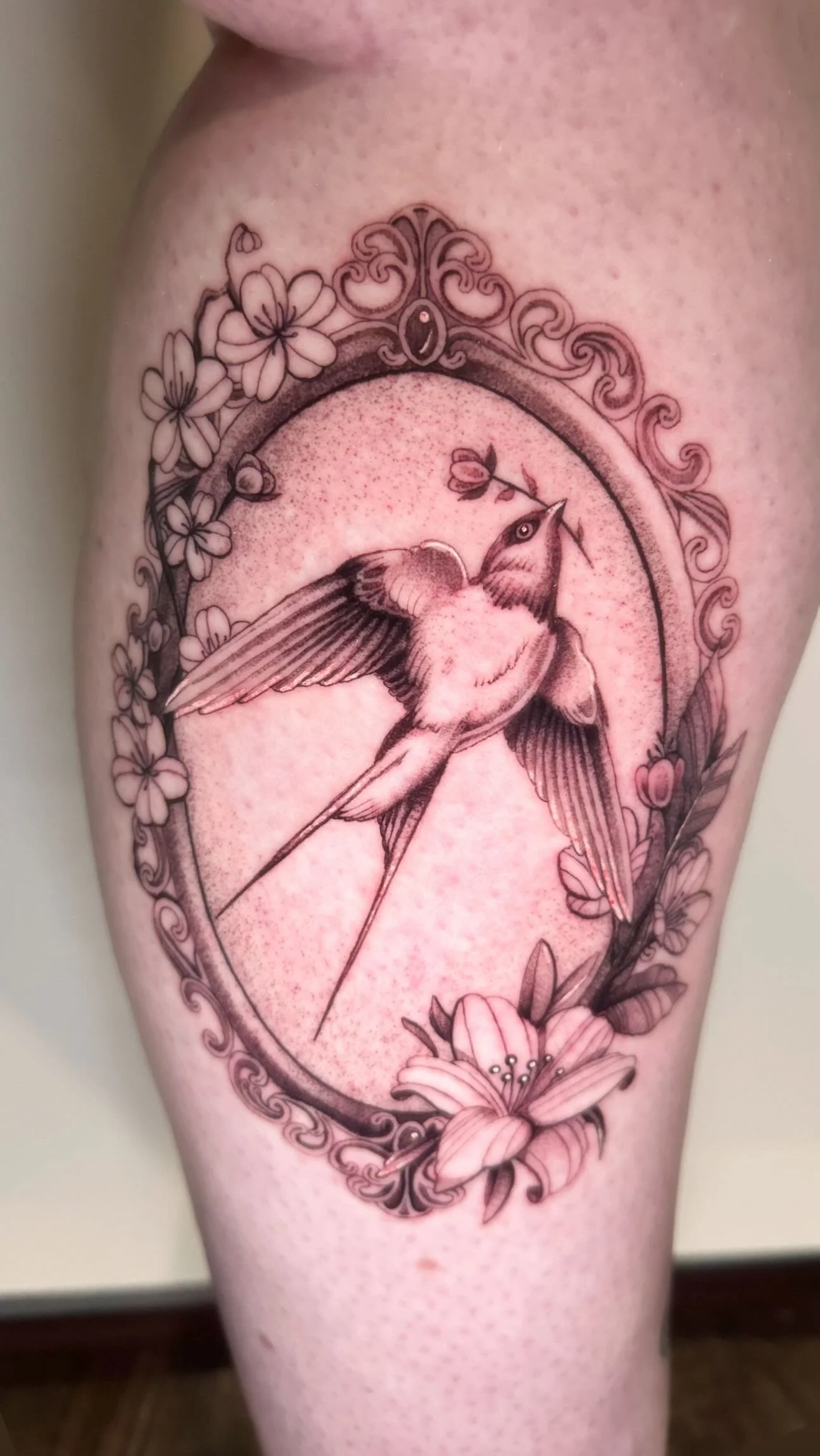 Fine line swallow in a floral frame for @colleen.orahilly ποΈπΌοΈπΈ really love how this one came out!!!